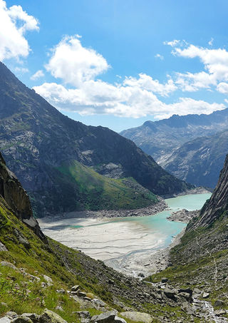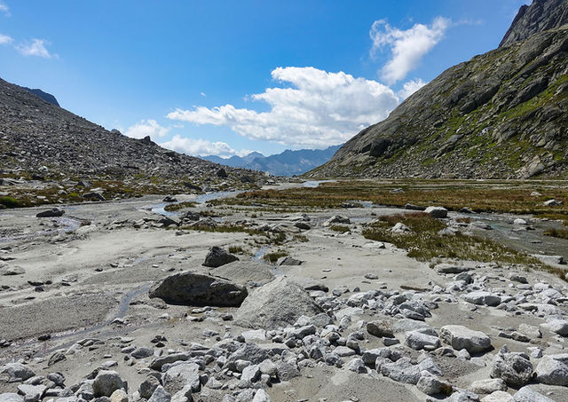 Juste avant le massif, bifurquer vers la gauche (est) dans les éboulis pour rejoindre la plaine alluviale. L'itinéraire reste relativement évident pour la rejoindre mais la pente est raide et les roches instables. Traverser la plaine en direction du sud-sud-est pour rejoindre la petite sente suivi à l'aller. Cette sente rejoint la Gelmerhütte.